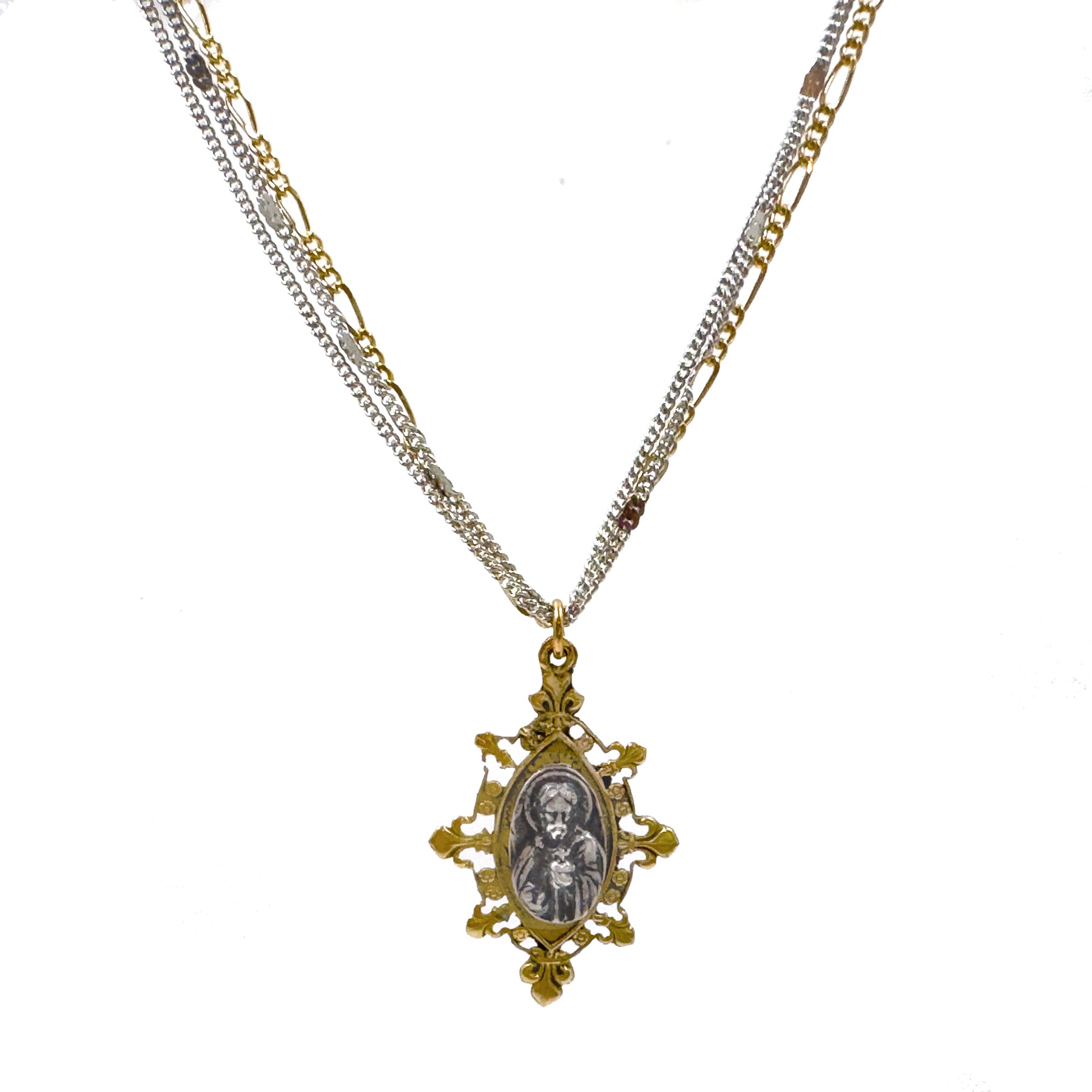 Two tone double chains with Sacred Heart charm. Approx 16" with extender.