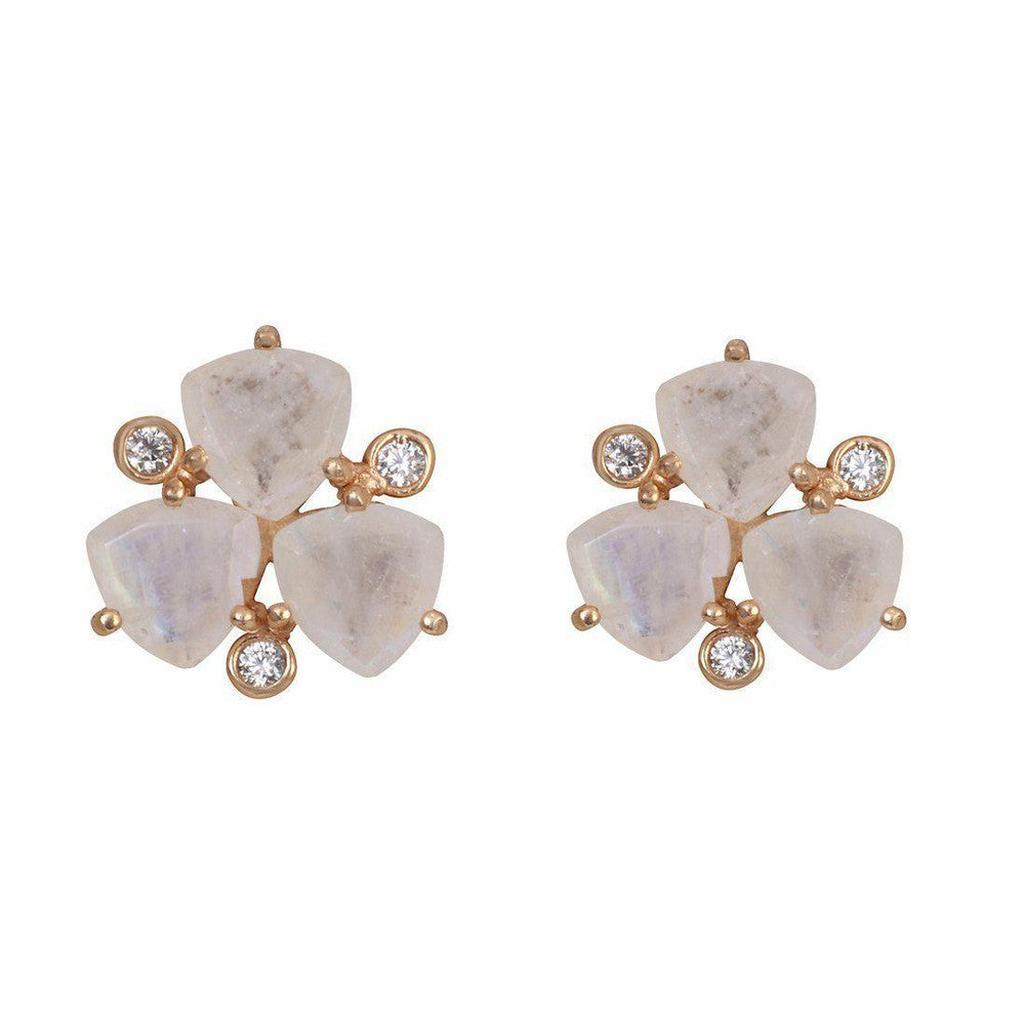 Three trillion cut moonstones with bezel set crystal stud earrings.