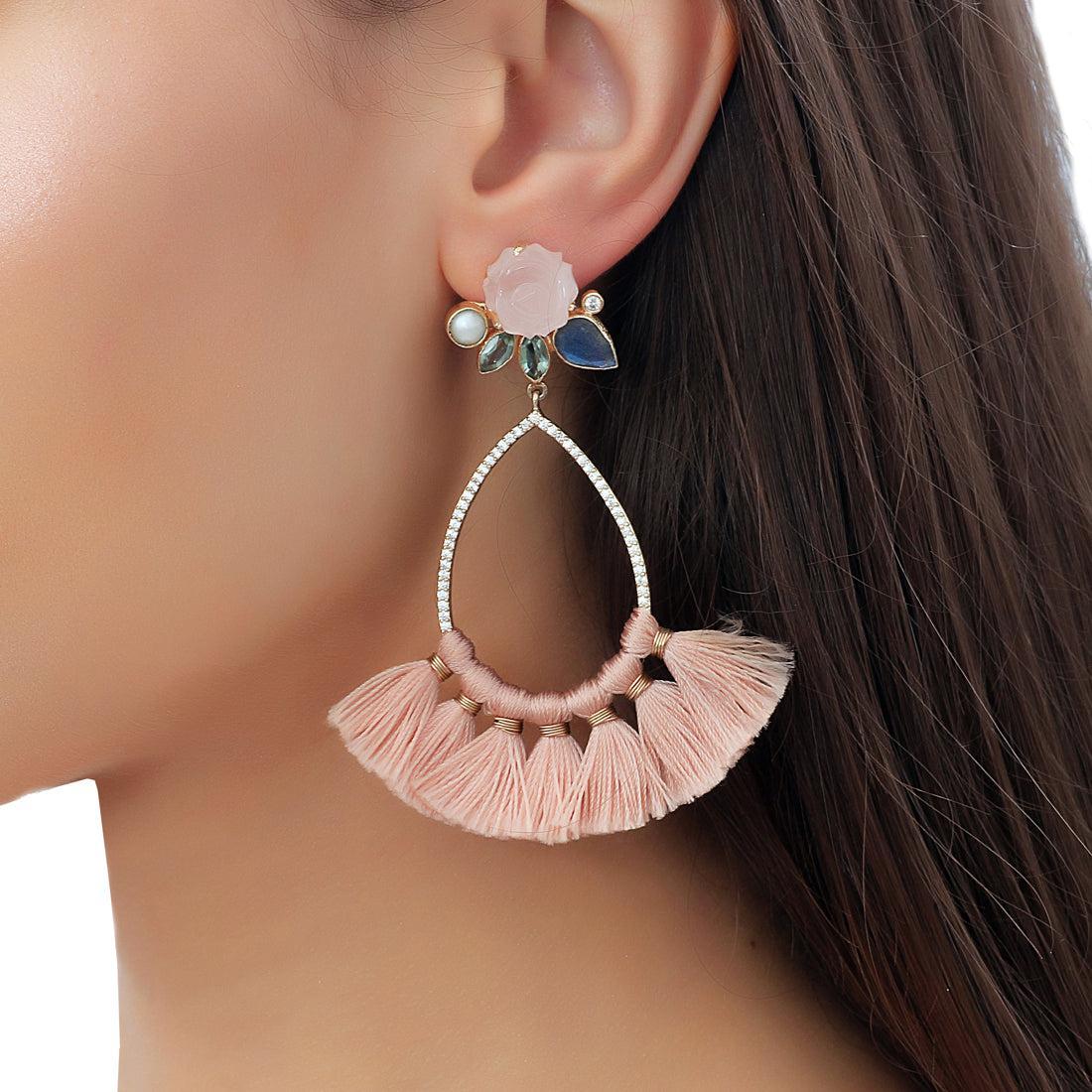 Trendy Tassel hoops with carved turquoise flower on post, accented with blue topaz and green onyx