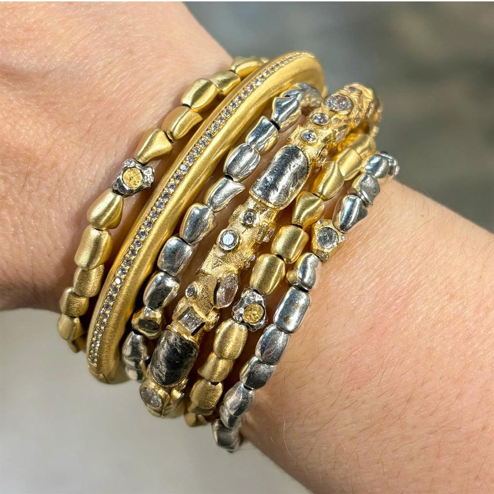 Gold Bangle with hammered finish and silver coins and cubic zirconia