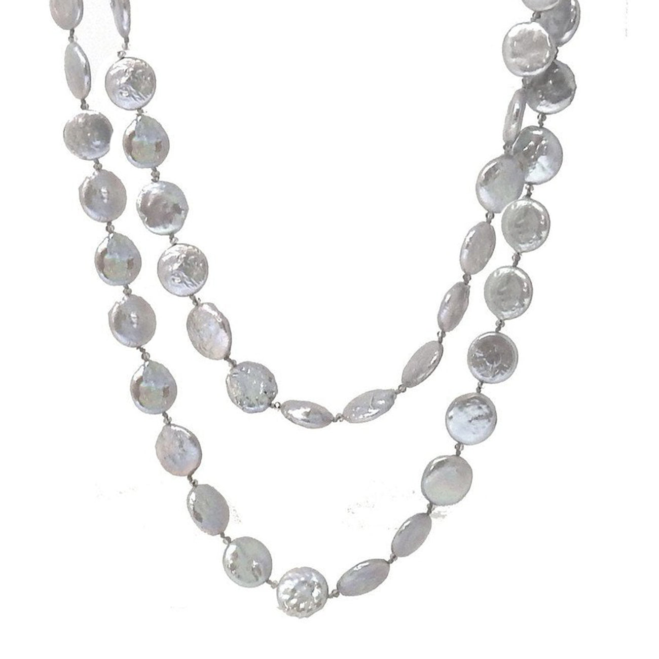 Long gray coin pearl necklace with silver clasp. Perfect alone or layered.