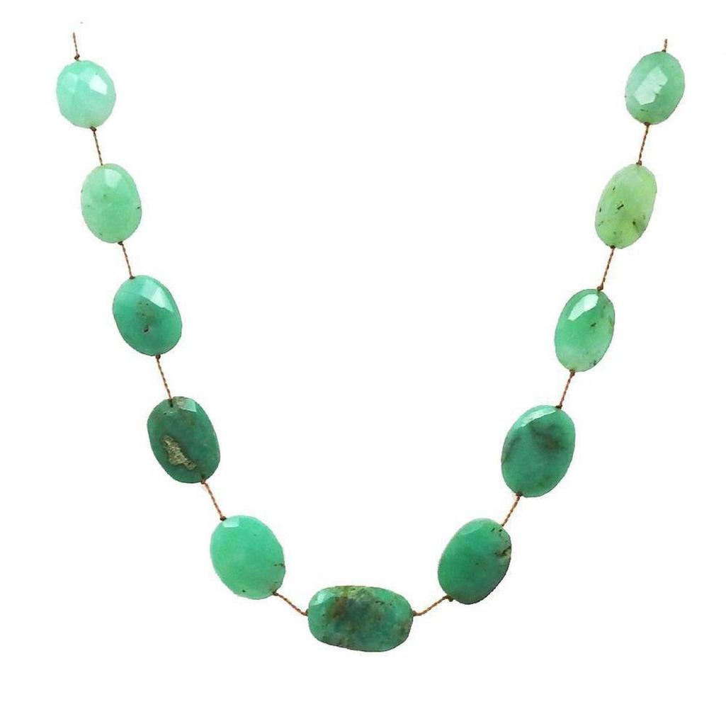 Floating stationed chrysoprase faceted stones on adjustable crocheted brown tassel necklace. Stones "float when against the skin!"