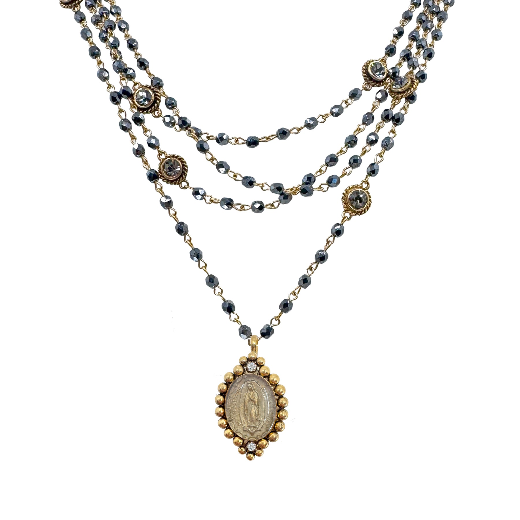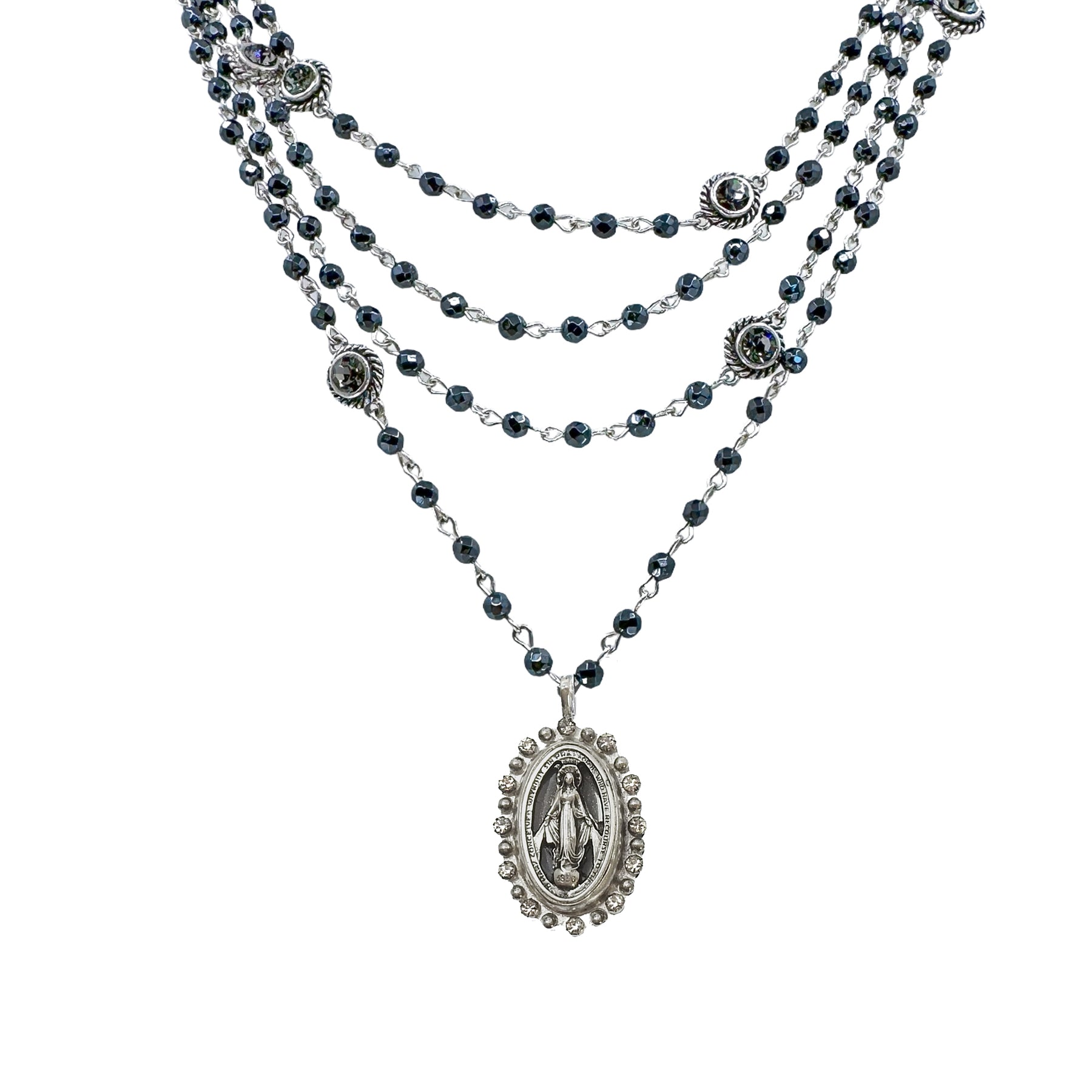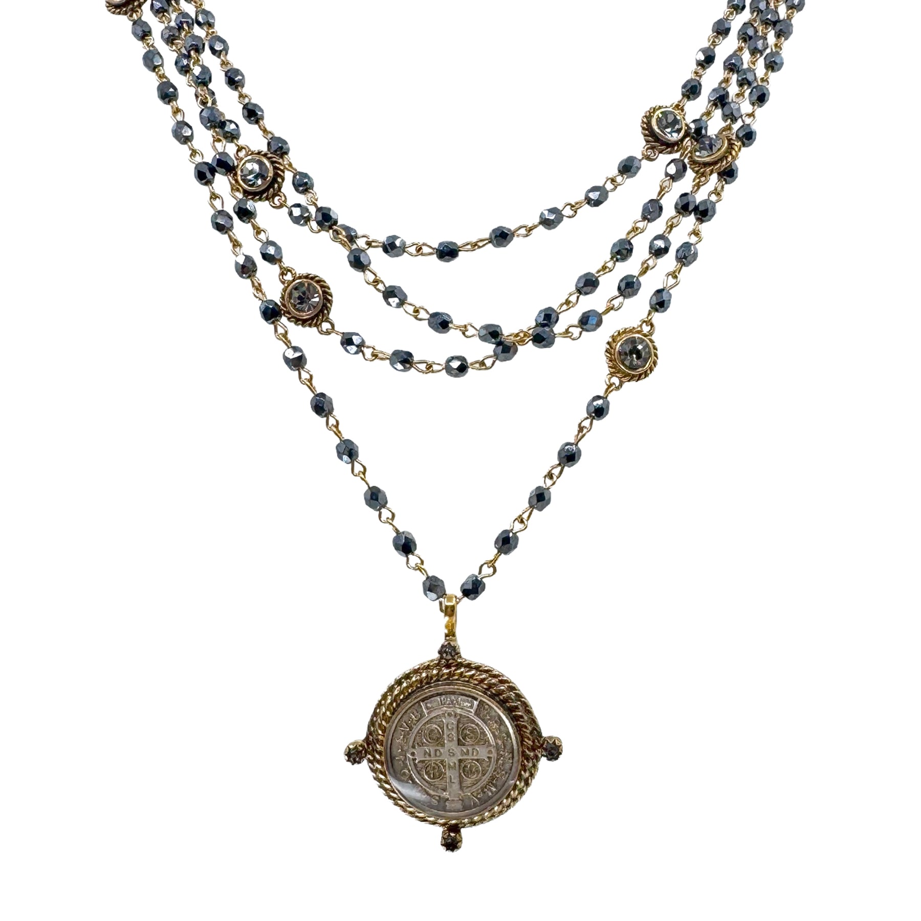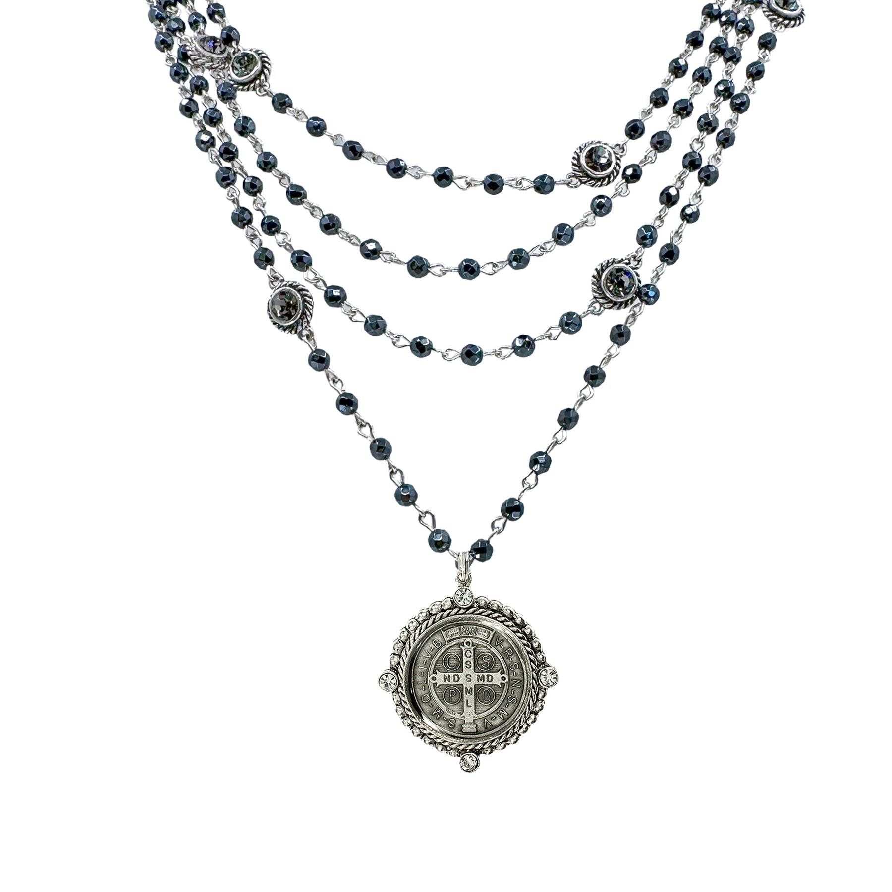 If you love sparkle, the San Benito Magdalena Necklace with Hematite crystals is for you. It features glittering and beads with stations of dazzling bezel-set gems The pendant is a blessed San Benito medallion from the Vatican. This versatile four strand necklace can be worn short or long! The Magdalena extender can be purchased for additional 4" length.