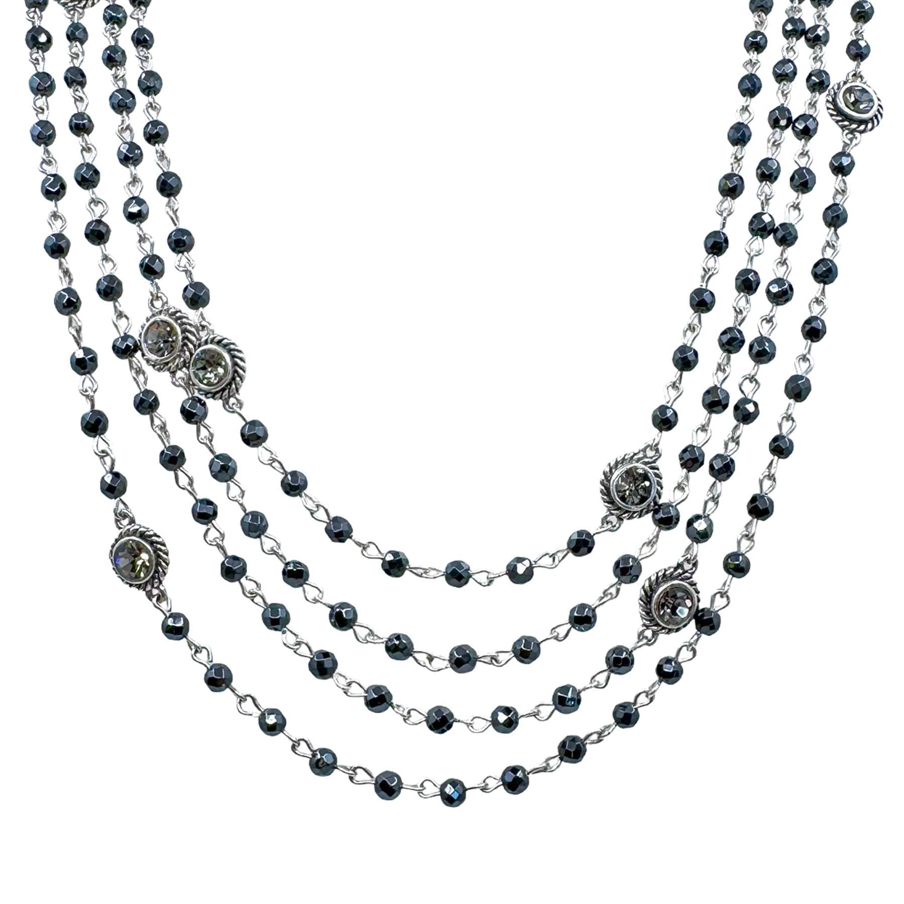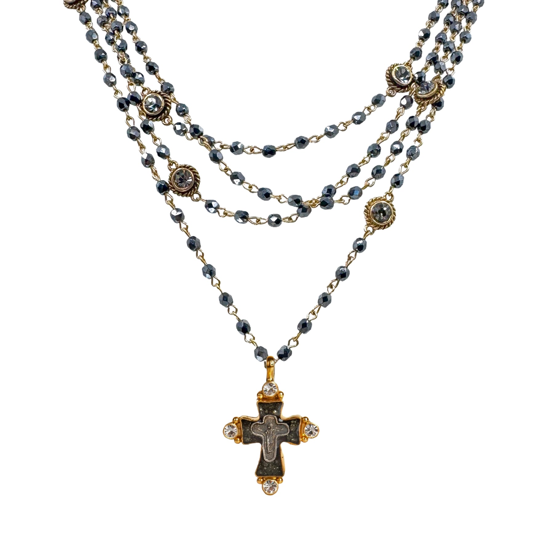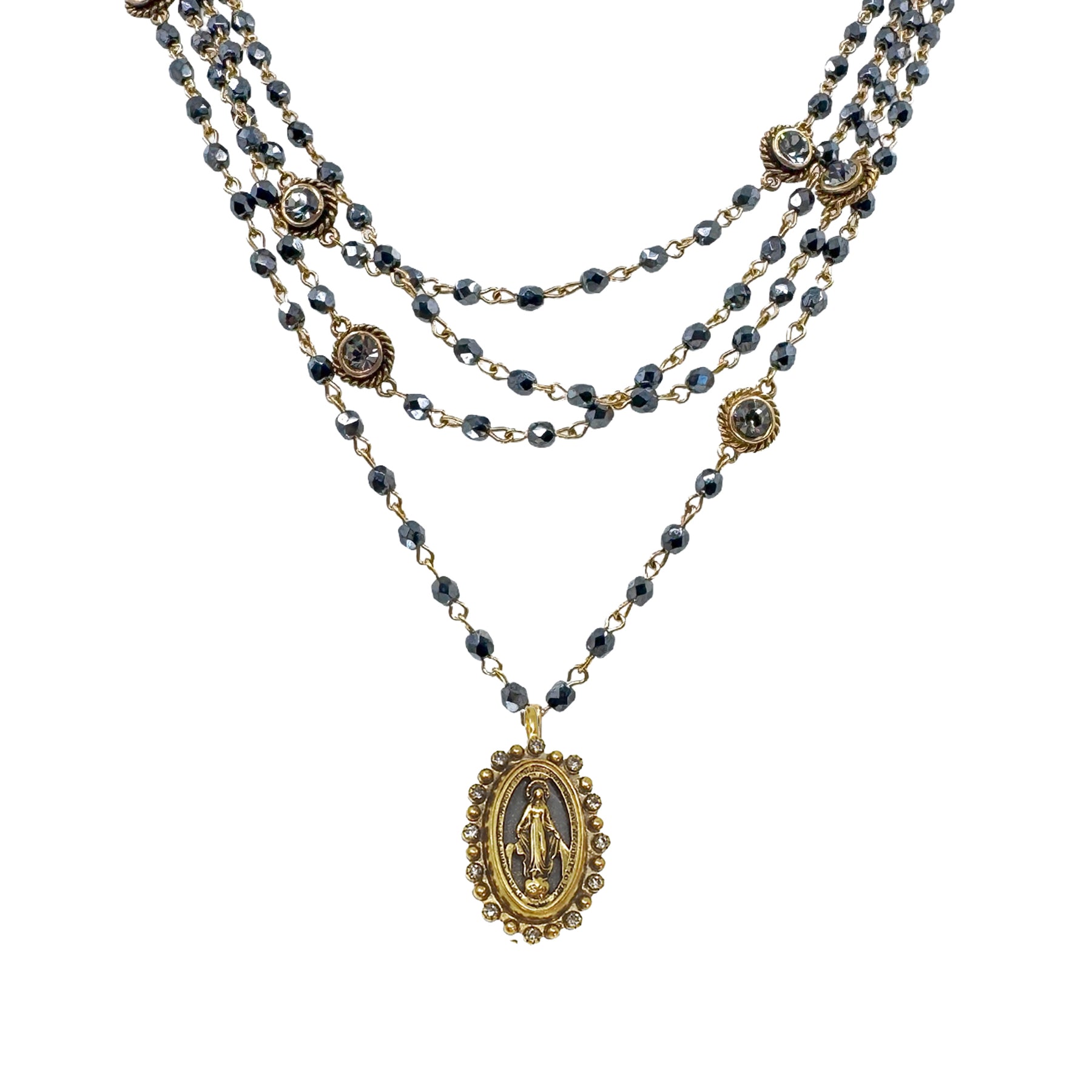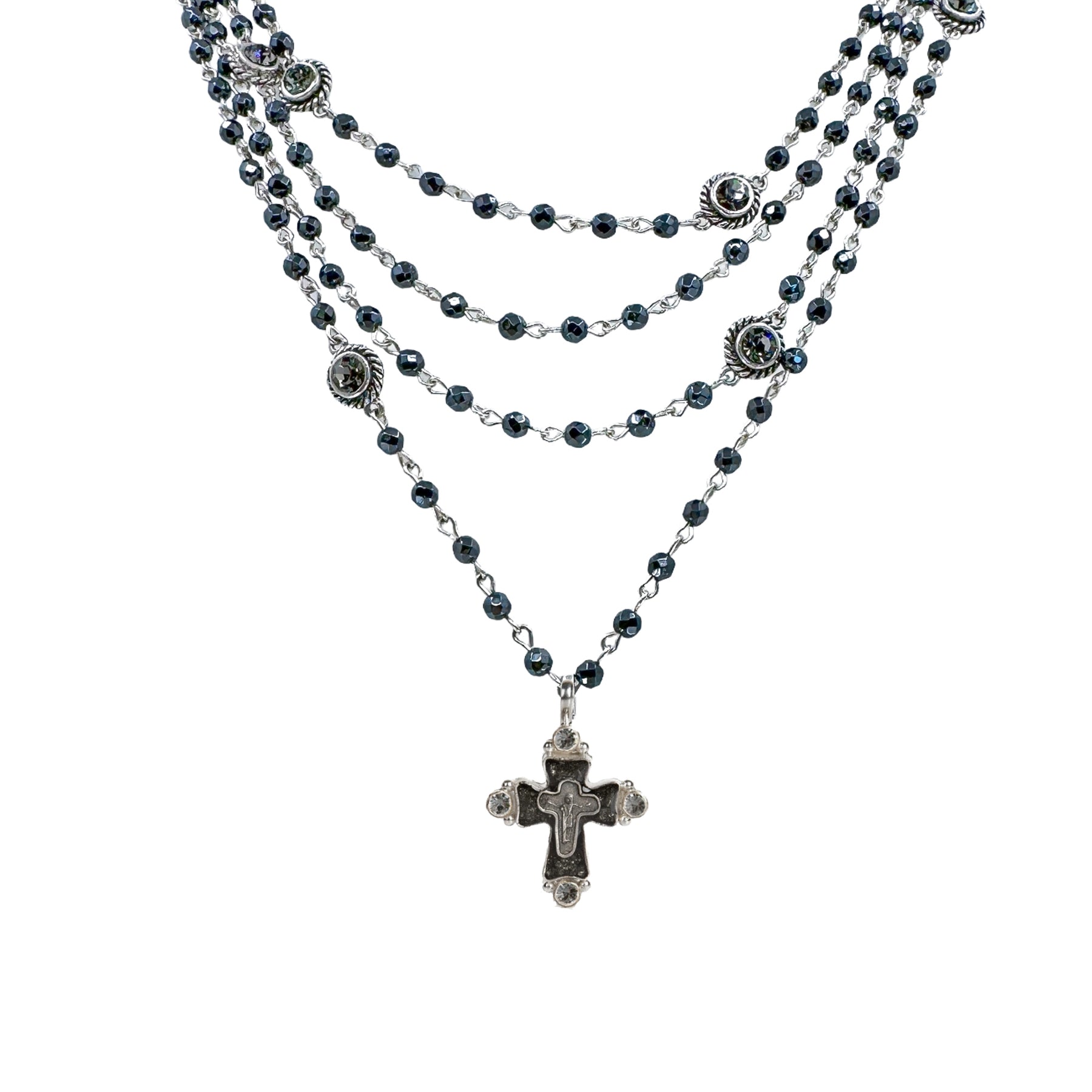If you love sparkle, the San Benito Magdalena Necklace with Hematite crystals is for you. It features glittering and beads with stations of dazzling bezel-set gems The pendant is a blessed San Benito medallion from the Vatican. This versatile four strand necklace can be worn short or long! The Magdalena extender can be purchased for additional 4" length.