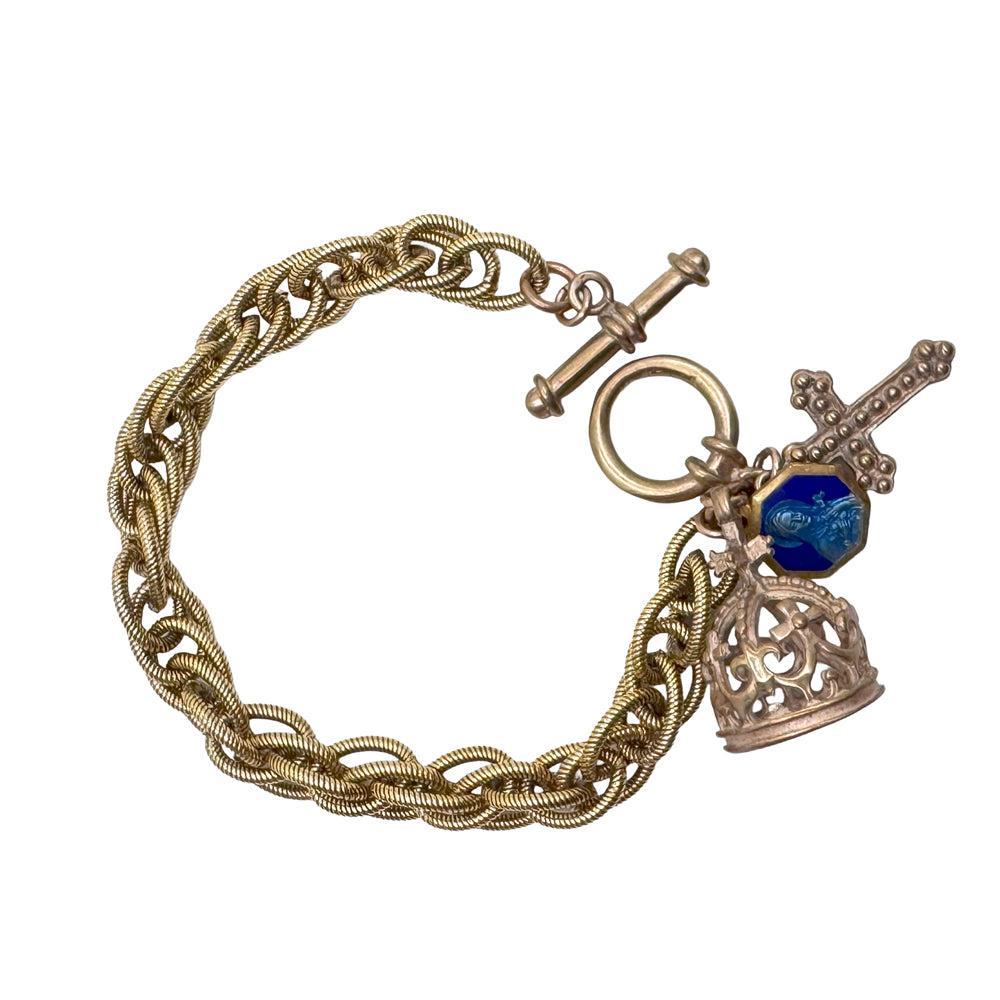 Beautifully delicate bracelet by Andrea Barnett with a crown charm, cross and Madonna on a vintage gold plated woven bracelet with a spring ring clasp.