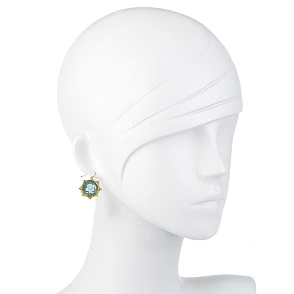Aqua Venetian Glass Fleur De Lis intaglios dangle Earrings. Crafted with intricately hand-blown glass from the Venetian tradition, these earrings exude luxury and exclusivity.