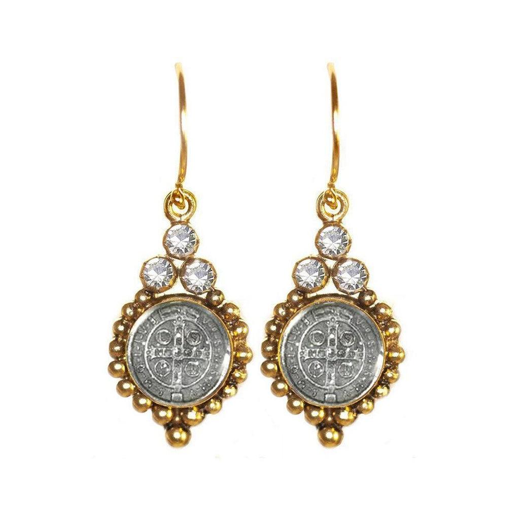 Sterling silver earrings with San Benito medallion in beaded bezel with three crystal accents