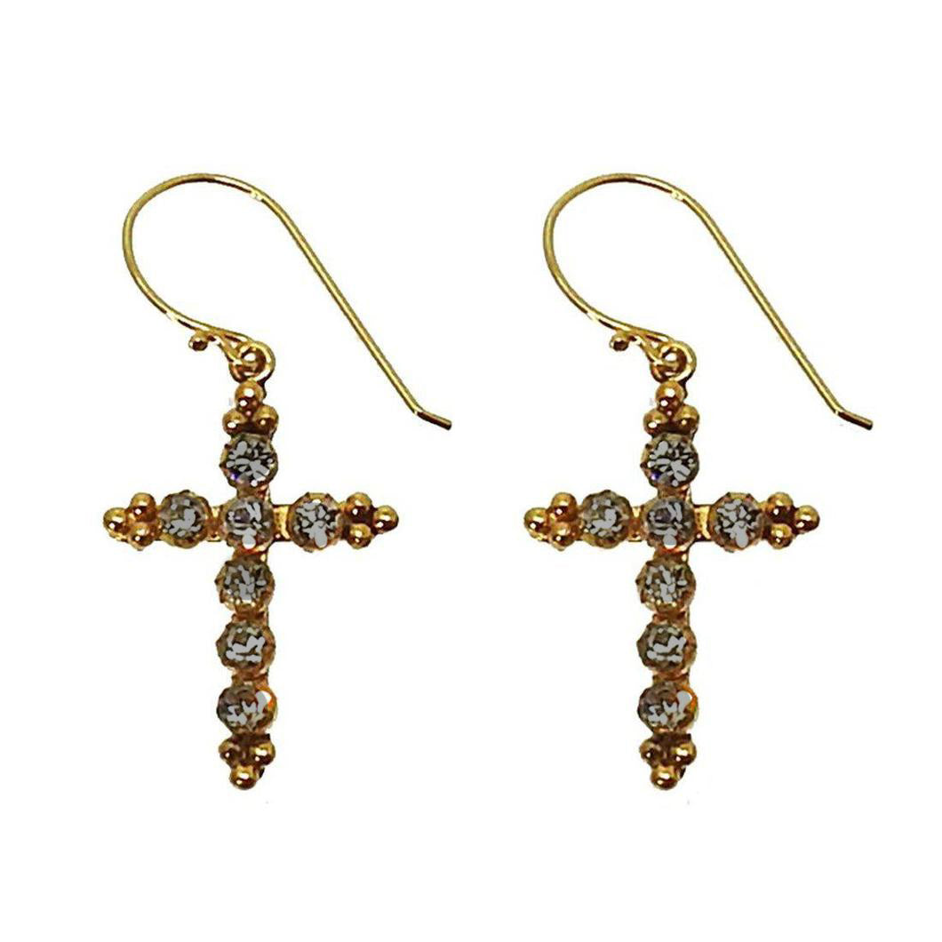 Virgins Saints and Angels Madonna Cross Hook Earrings feature a cross with round bezel set Swarovski crystals. The earrings measure approximately 1.5" long and 0.75" on a french wire back.