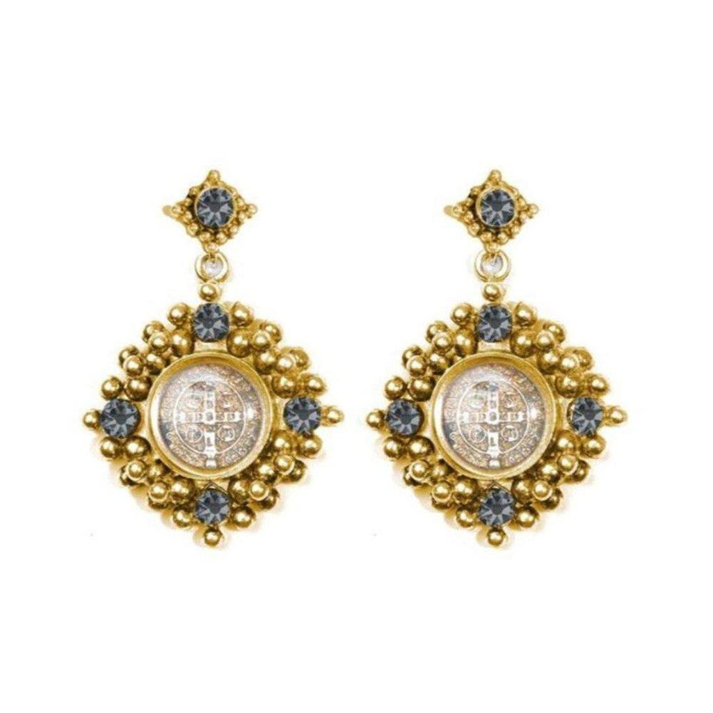 Petite Cloister Post Earrings in gold or silver, with intricately detailed San Benito coin medallions set in beaded bezels embellished with Swarovski crystals in clear and silver night, and post closure. Approx 1.5" long