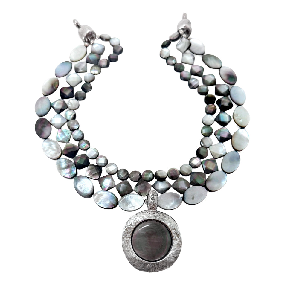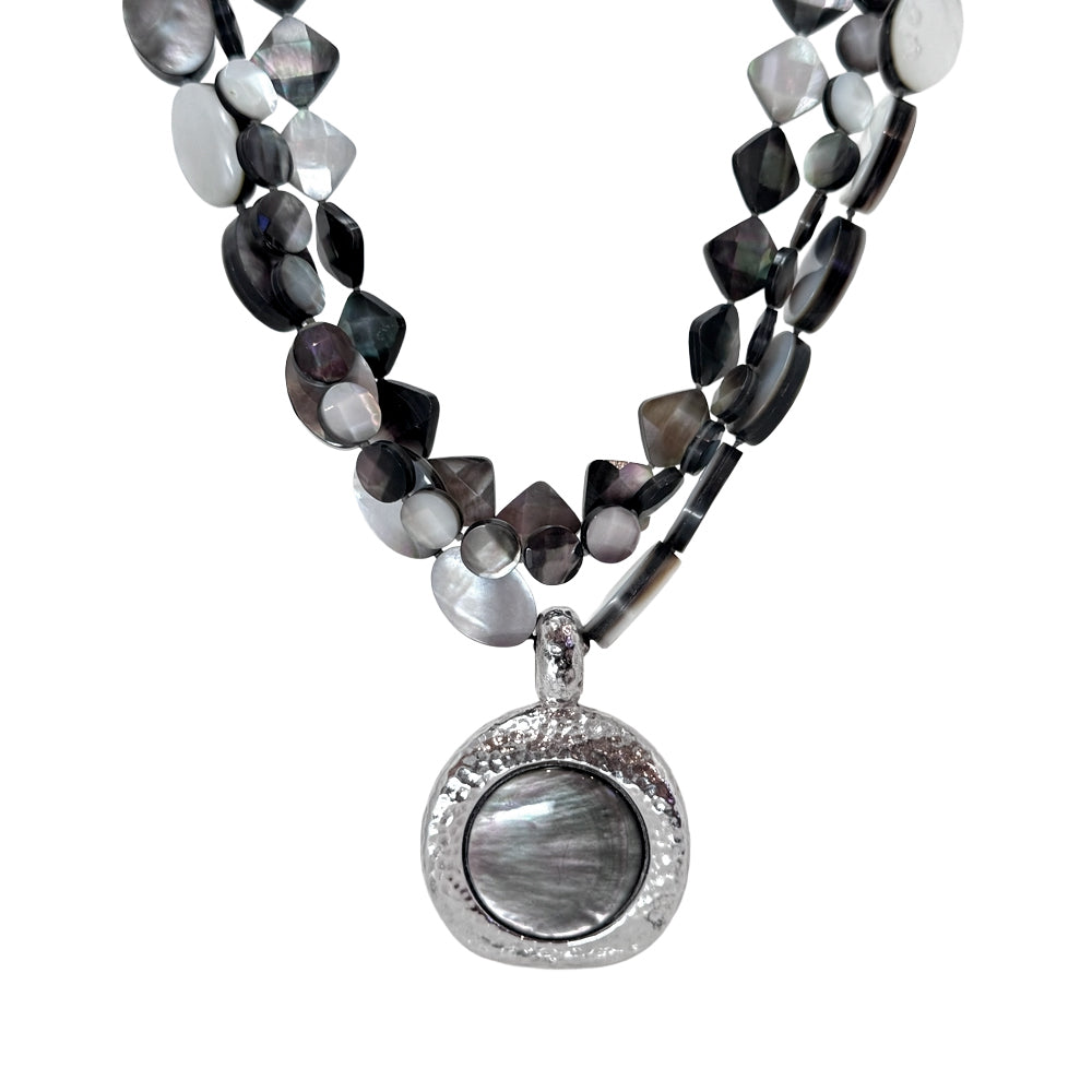 Three Strand Black Mother of Pearl Pendant Necklace with round mother of pearl pendant set in hammered silver frame