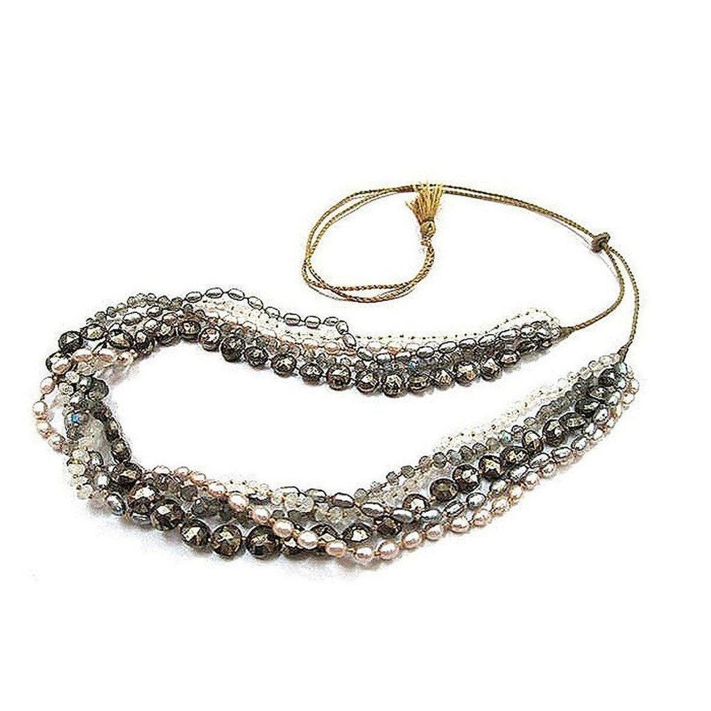 Lena Skadegard hand crafted multi strand necklace with labradorite, pyrite, and pearls.