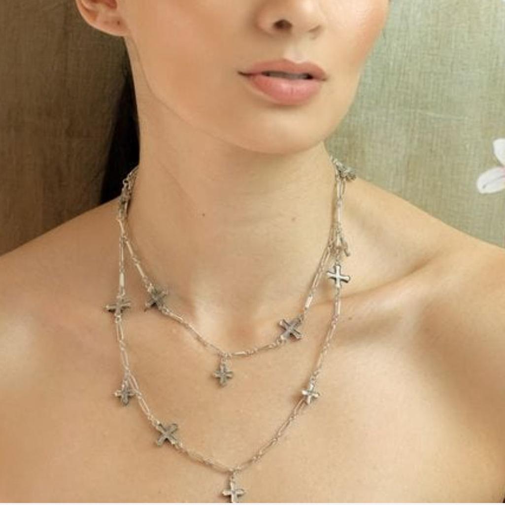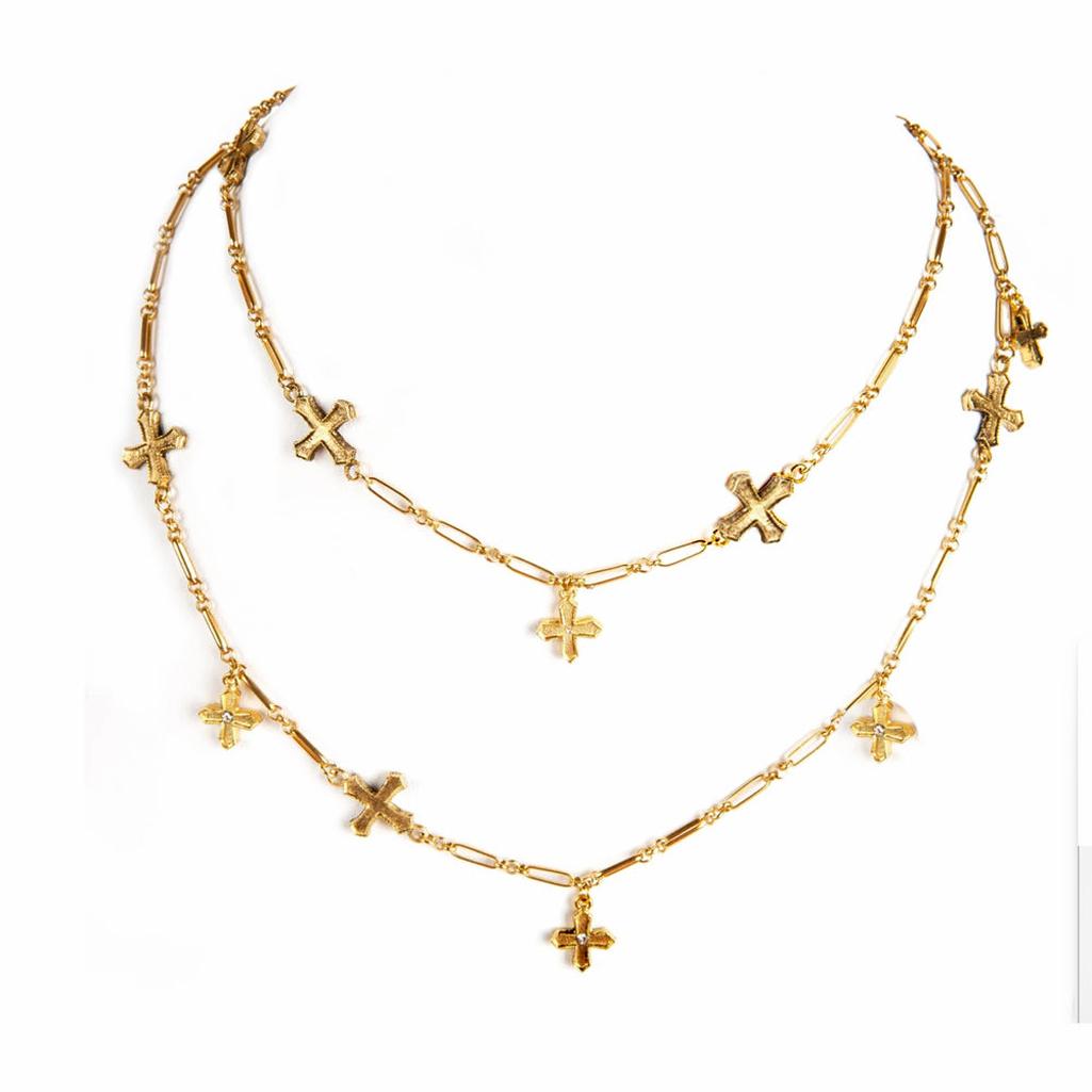 Pax Multi cross Wrap in gold is a delicate chain with dangling and stationed crosses in gold-dipped stations. With 36" to play with, wear it as one long strand, doubled, or wrapped as a stunning bracelet.