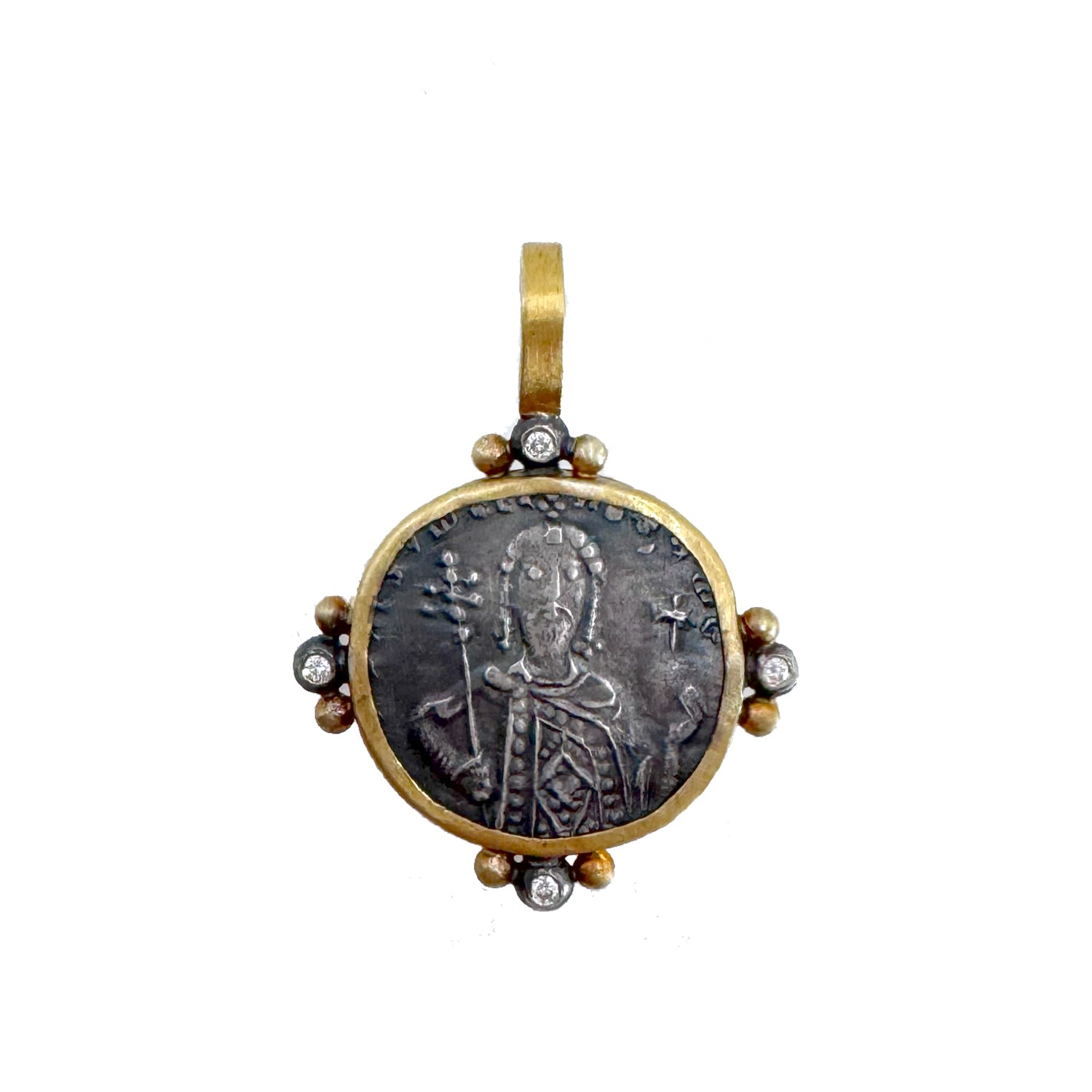 This byzantine replica coin depicts Constantine and is crafted in sterling silver and 24k gold. This pendant can be worn alone or with other medallions