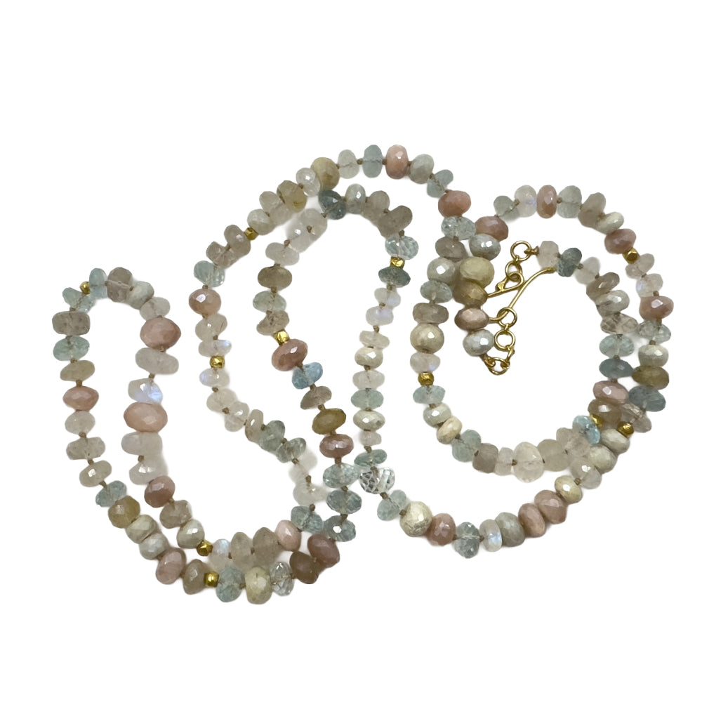 Glittering multi gem necklace in faceted Aquamarine, Silverite and moonstone,with 18k gold accent beads.