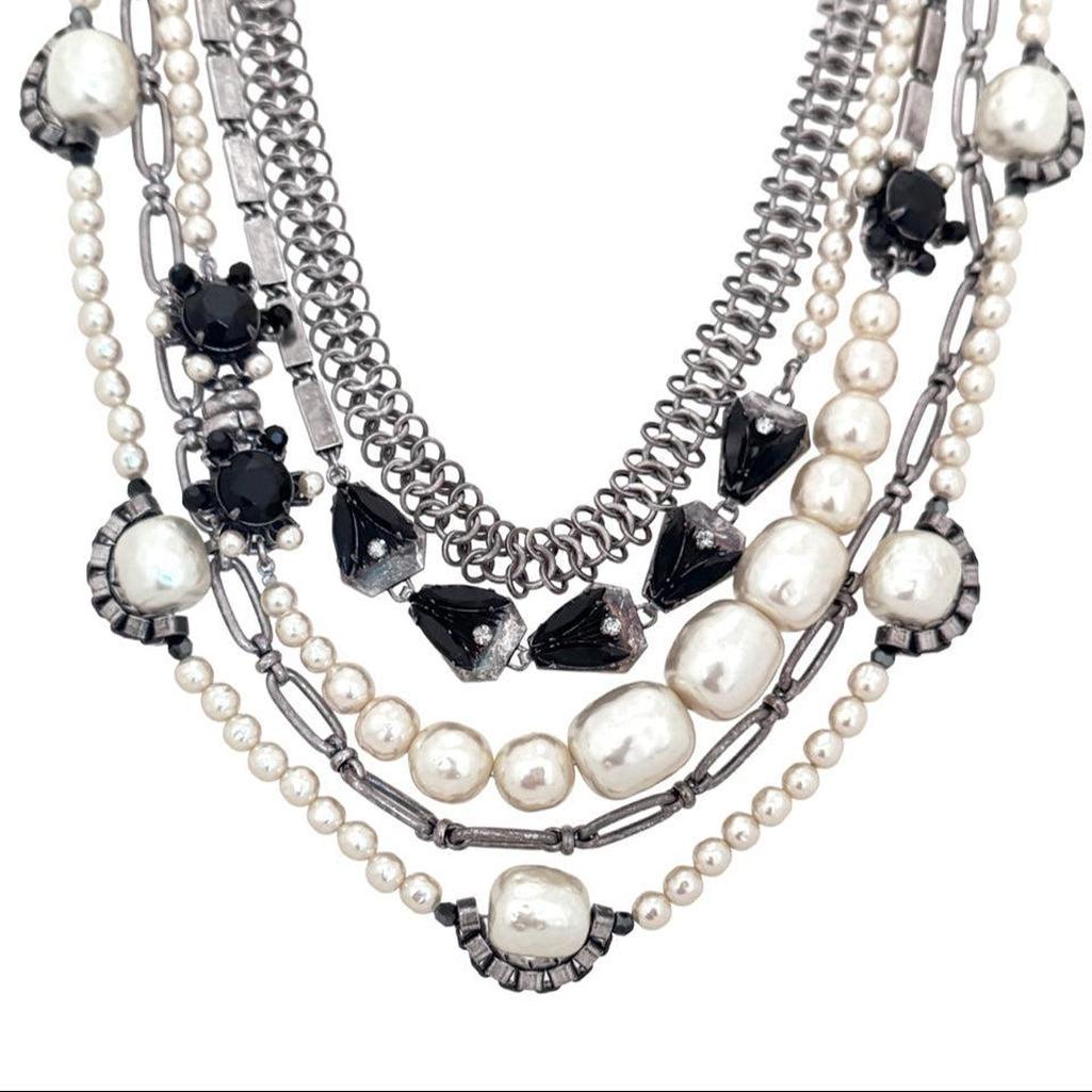 Multi strand necklace with an edgy combination of pearls woven silver chain, and black beads create a modern statement with classic materials.