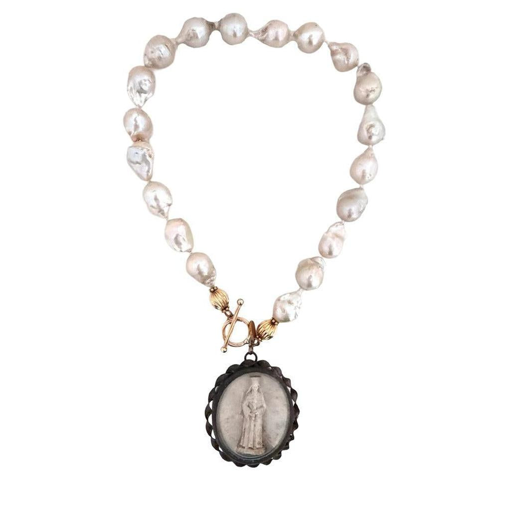 Antique carved Icon of saint with cross, signed. Circa 1870. Icon is framed in bronze frame with ribbon detailing on blush baroque pearls.