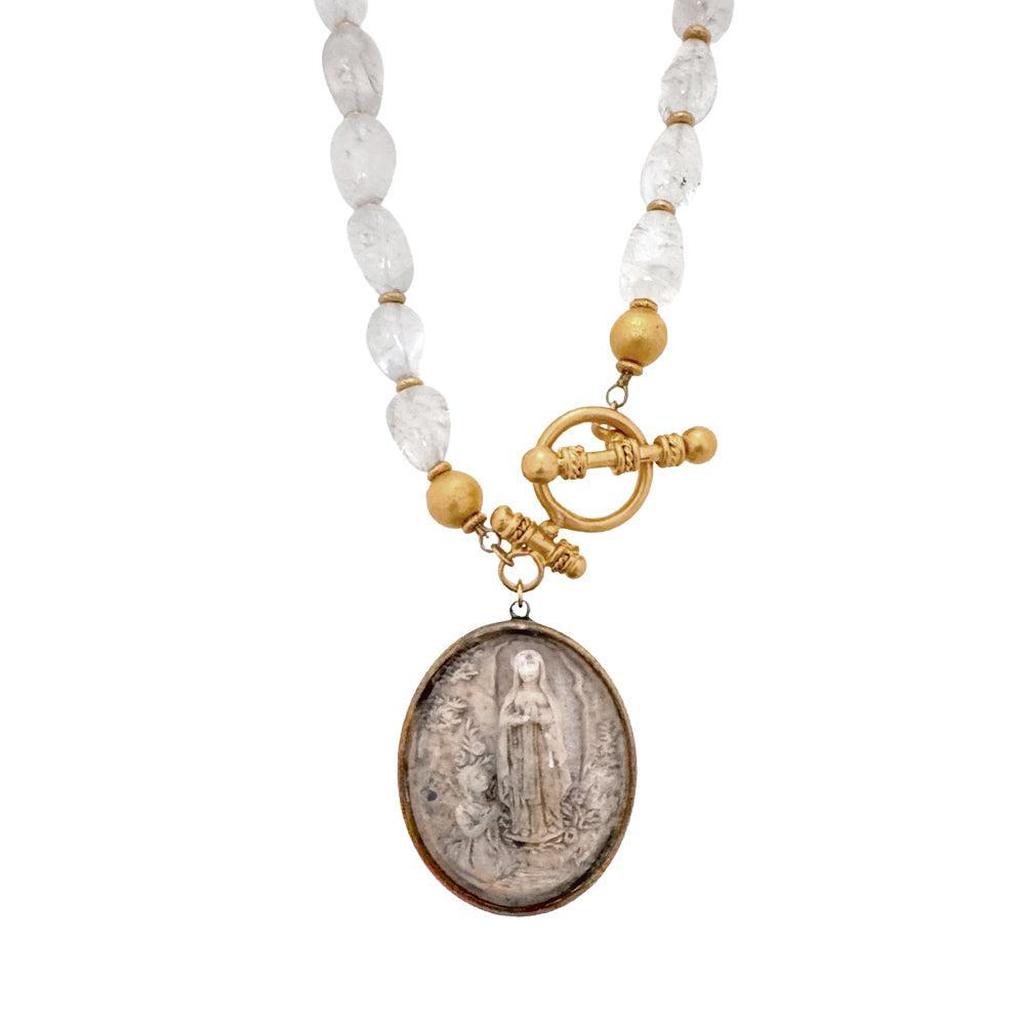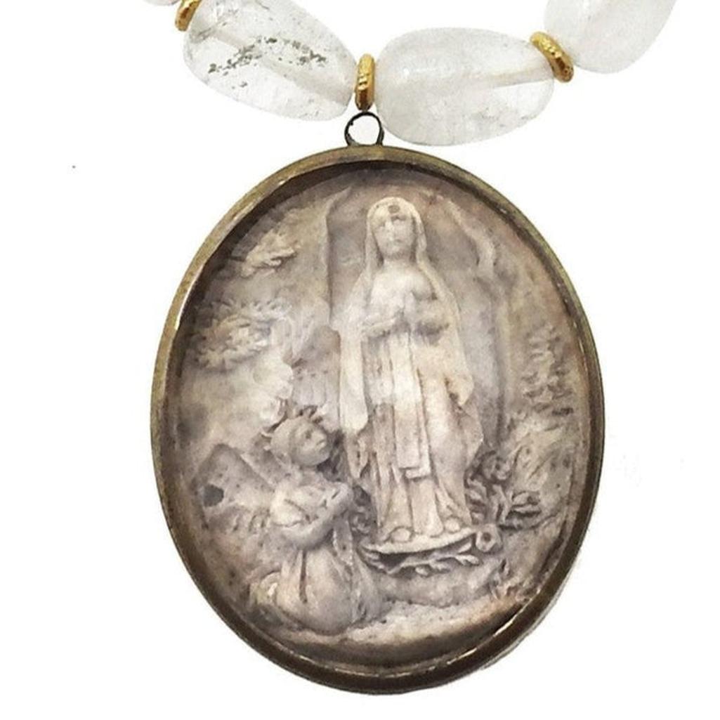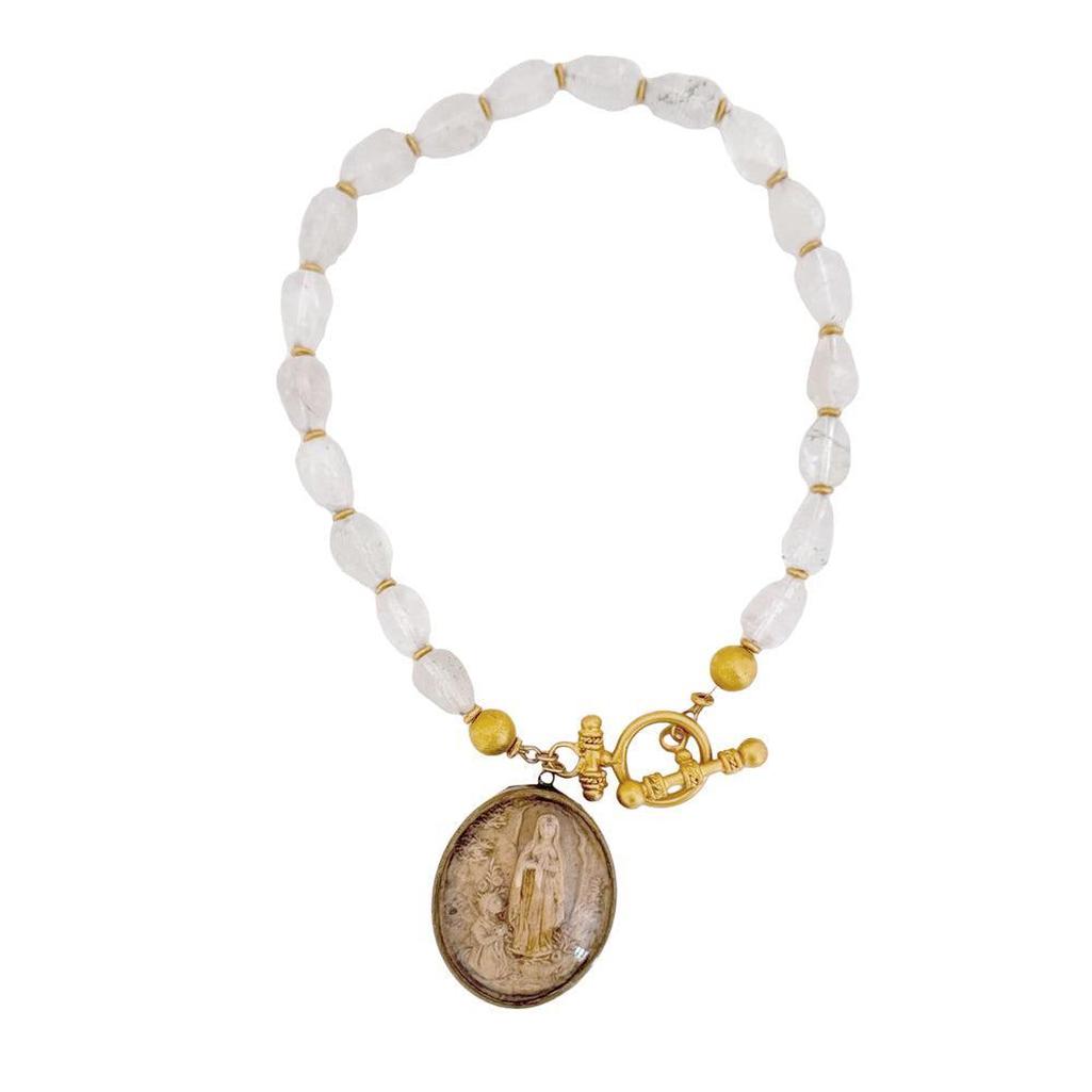 Antique Icon of St Anne, and Mary depicted as a child, praying on polished rock crystal beads with gold accents and toggle. Saint Ann is thought to be the mother of Mary.