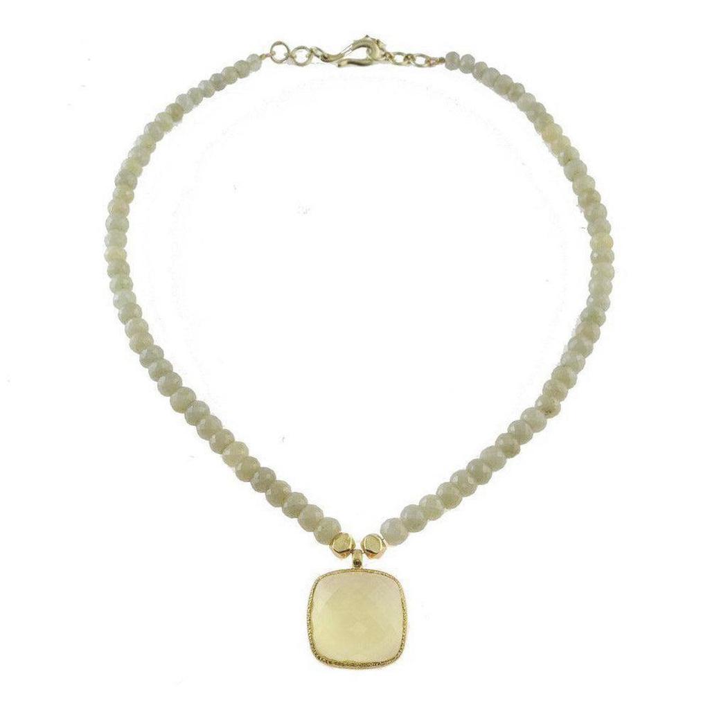 Grey Sapphire and Lemon Quartz Necklace Faceted gemstones allow this beautiful necklace to sparkle. Made with grey sapphire and lemon quartz stones set in 24K gold vermeil with a hook clasp. This necklace measures approximately 18-19" long with pendant measuring 1" wide.