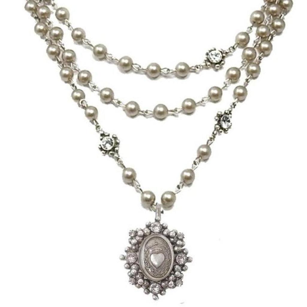 Oval San Benito Magdalena. The romantic Magdalena necklace from Virgins, Saints & Angels is a multi-strand layered necklace that is studded with jewels set with a precious Oval San Benito Medallion embellished with crystal stones. Wear Long or Short. The Magdalena extender can be purchased for additional 4" length.