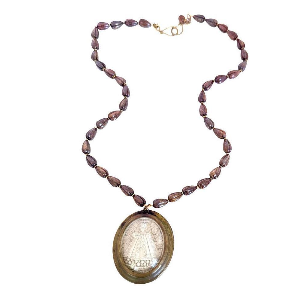 Antique Icon Our Lady of Hal, circa 1800 Ivory with Bronzite. Approx 32" long with bronze hook clasp.