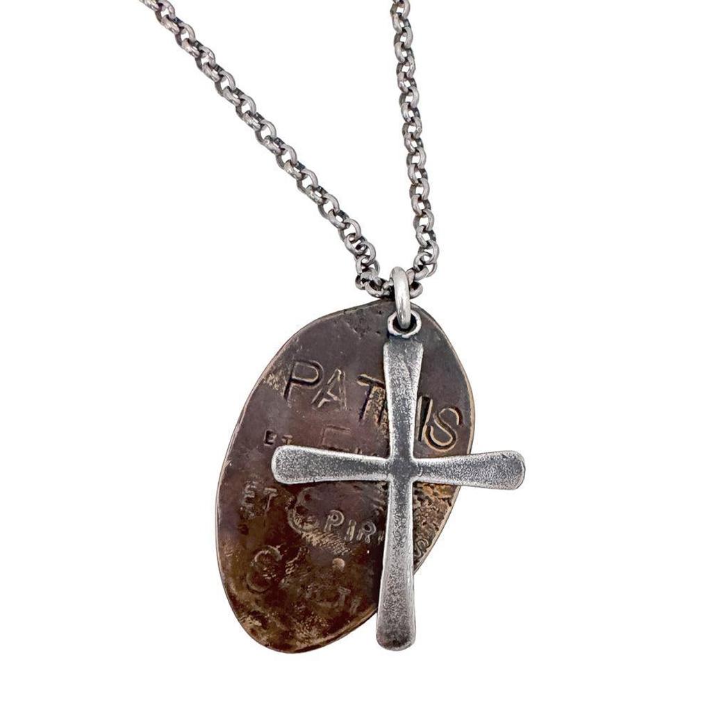 Sterling silver rolo chain with oval bronze medal and silver cross. Hand stamped and made in Seattle.