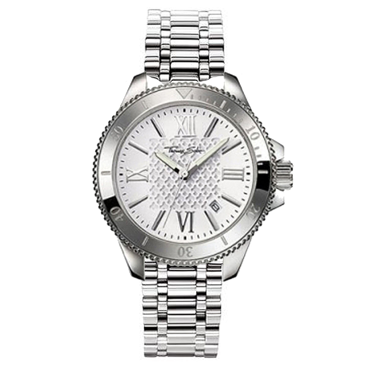 A 38 mm stainless steel with rotatable bezel with a white shiny two-layer dial with lily patter and luminous hands on a stainless steel band, stainless steel butterfly clasp.