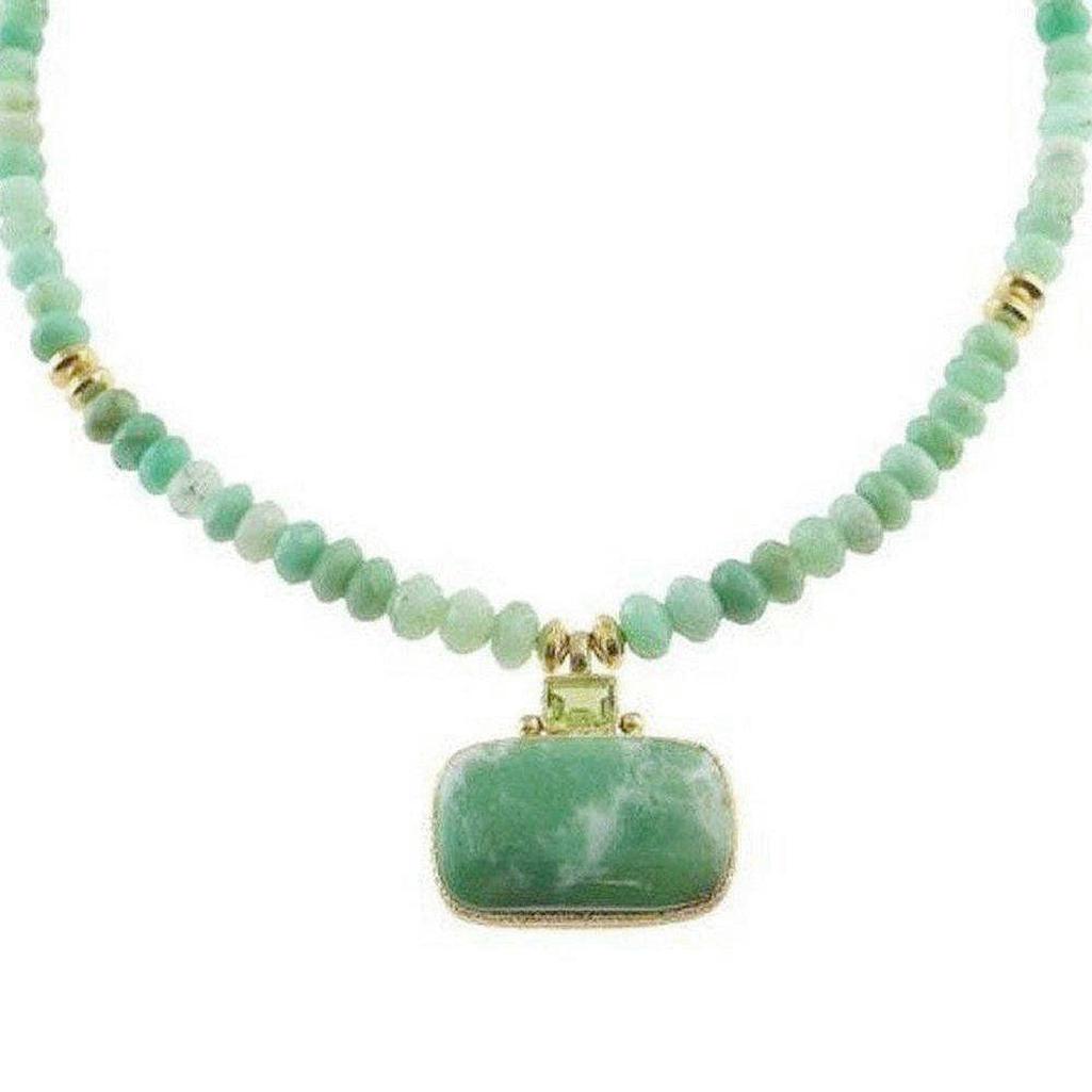 Chrysoprase and Peridot Necklace Faceted gemstones along with a smooth polished pendant allow this beautiful necklace to sparkle. Made with chrysoprase and peridot semi-precious stones set in 24K gold vermeil with hook clasp. This necklace measures approximately 18-19" long and the pendant measures approximately 1.5" long and 1.25 wide.