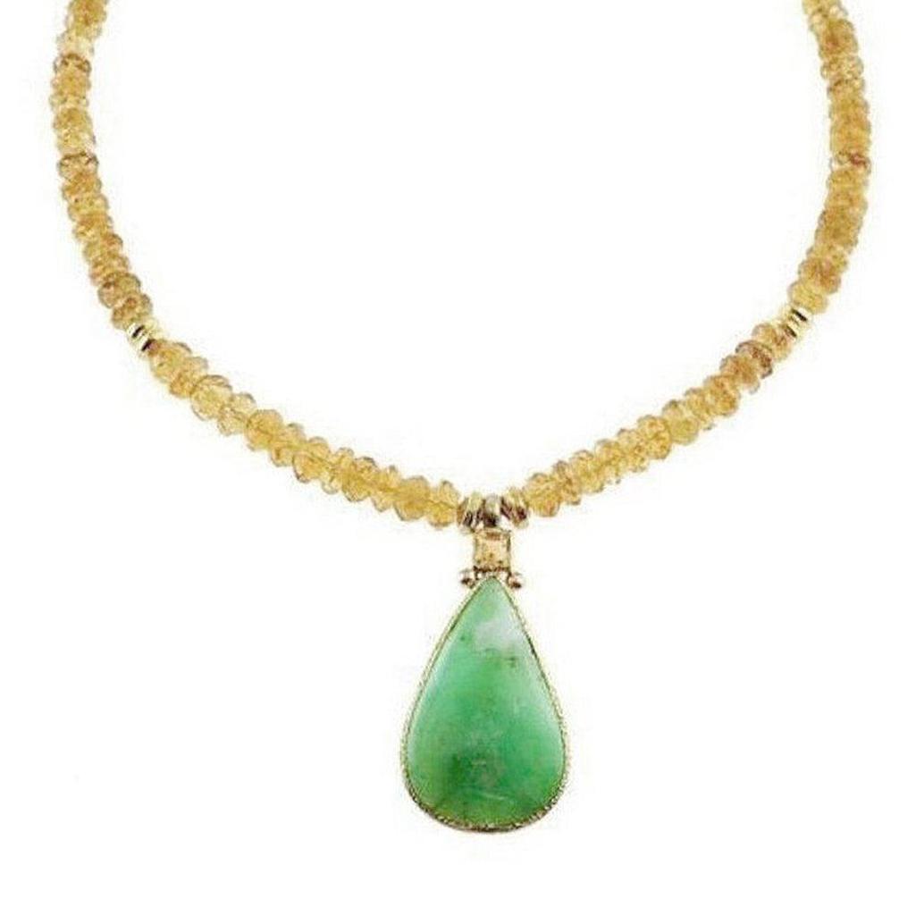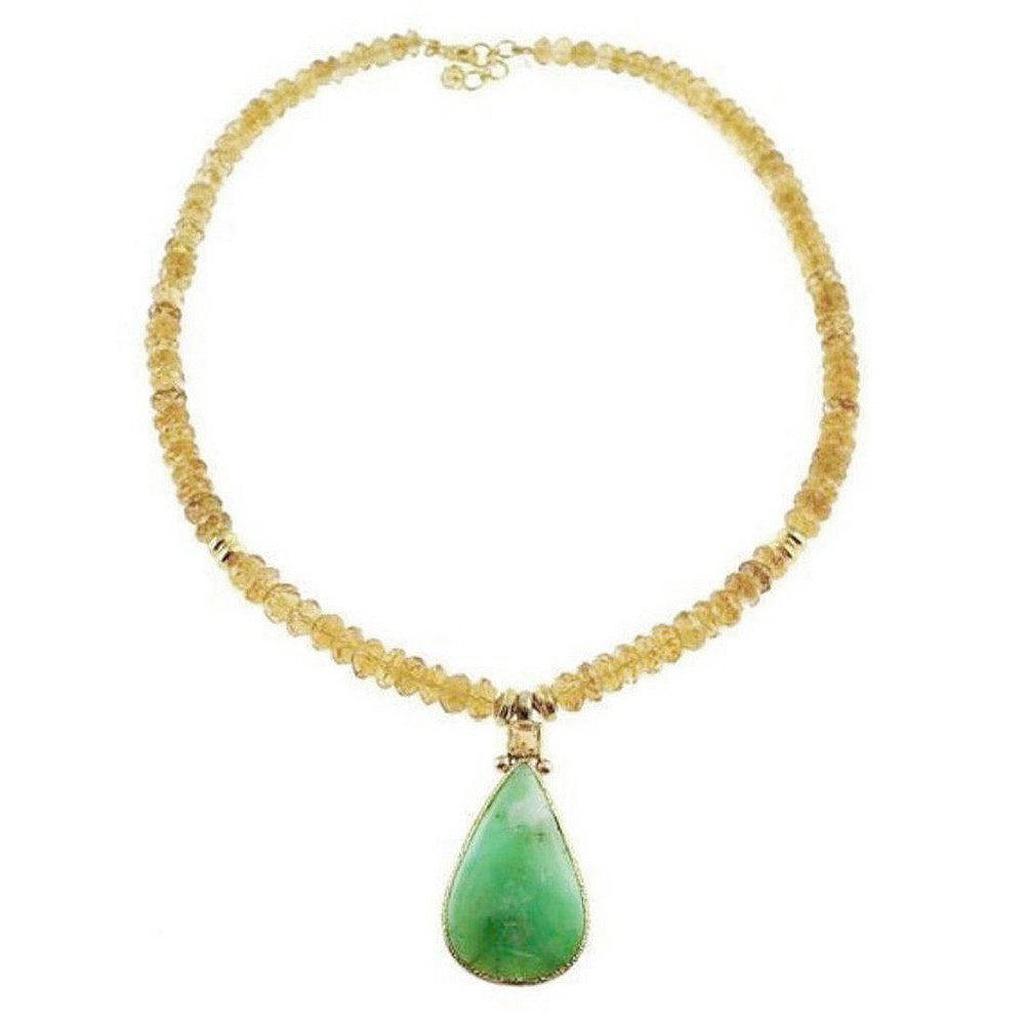 Citrine and Chrysoprase Necklace Faceted gemstones along with a smooth polished pendant allow this beautiful necklace to sparkle. Made with citrine and chrysoprase semi-precious stones set in 24K gold vermeil with lobster claw clasp. This necklace measures approximately 18-19" long and the pendant measures approximately 2" by 0.75".
