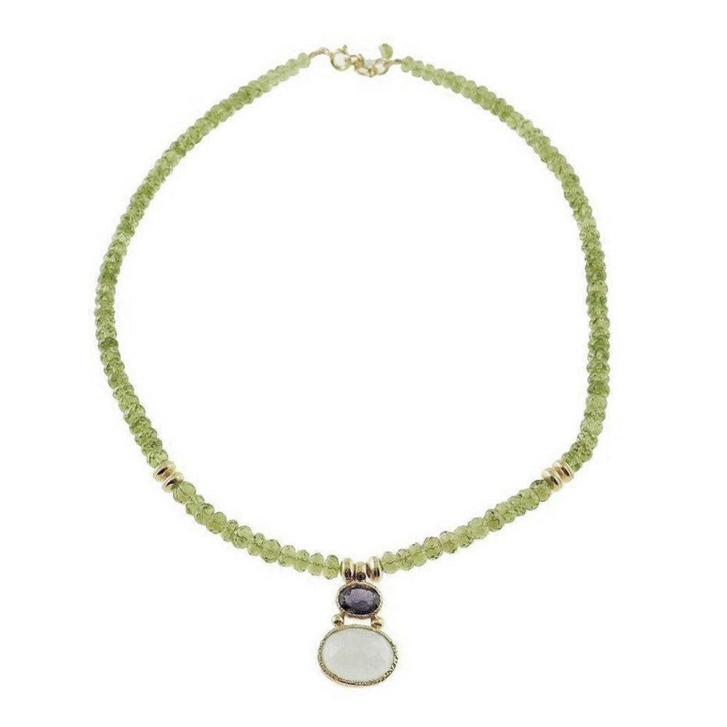 Peridot and Kyanite and Chalcedony Necklace Faceted gemstones allow this beautiful necklace to sparkle. Made with peridot, kyanite, and chalcedony stones set in 24K gold vermeil with lobster claw clasp. This necklace measures approximately 17-18" long with pendant measuring 1 inch by 0.75 inches.