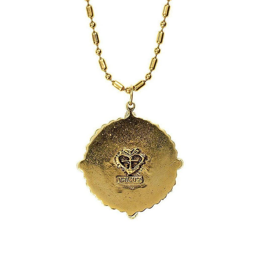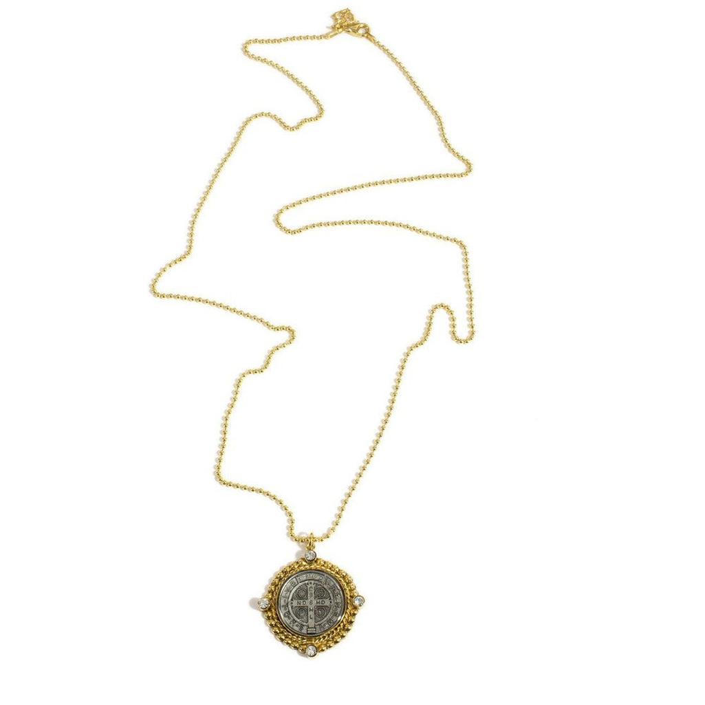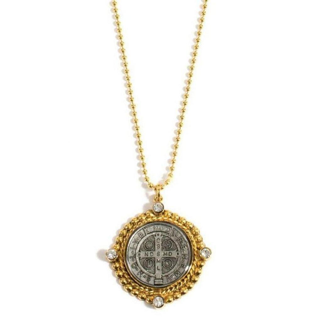 Celebrate your loving spirit with the San Benito Charm in Gold with your Choice of crystals. It features a genuine San Benito coin set in an elegant rope and bead design set with four shimmering crystals. The pendant is gold dipped, measures approximately 1.25" in diameter and comes with a matching 32" ball chain.
