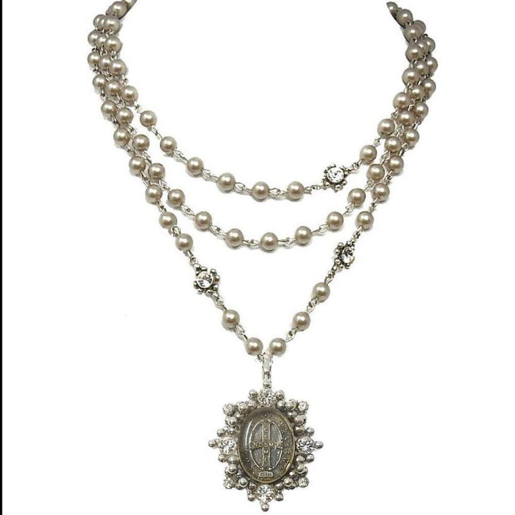 Tres Gracias Magdalena Necklace features three strands of shimmering beads and dazzling crystal stations that can be worn in different length combinations. The removable pendant, created from a genuine medal from the Vatican, is encircled with beads and crystals. The Magdalena extender can be purchased for additional 4" length. The Magdalena extender can be purchased for additional 4" length.